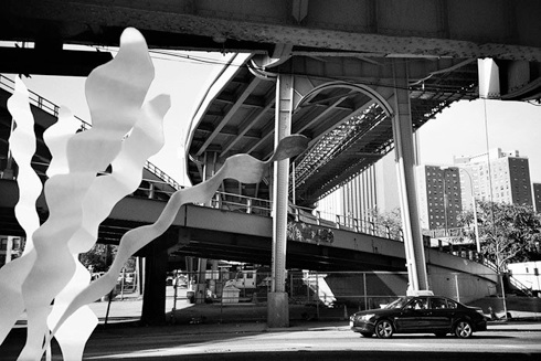 Curly-leaf pondweed (Potamogeton Crispus) and the Brooklyn Bridge above.