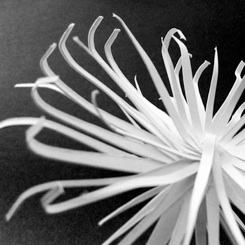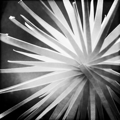 Another plant sculpture had many separate, thin petals, which formed a geometrical shape, a kind of sphere, like a frozen sparkler. Some petals that were reachable from the street were fitted with an artificial eye, through which one could see specific locations in the city or in the vicinity, where these plants were growing.